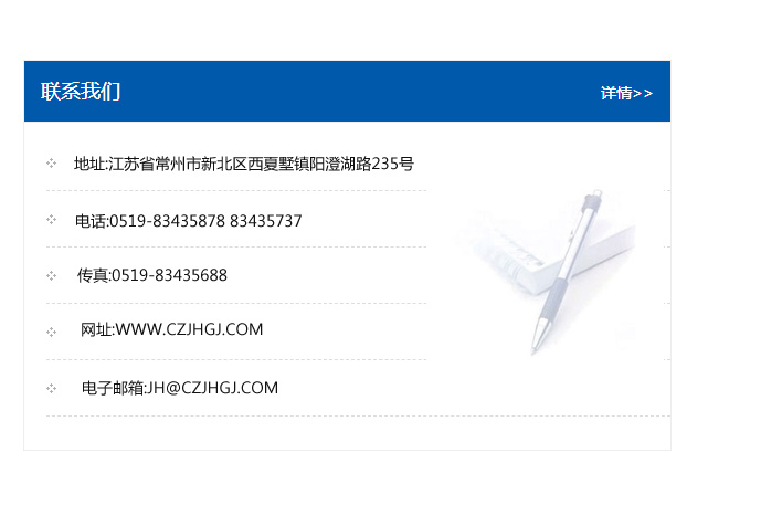 地址:常州市新北區友邦商務大廈1幢16、17層  電話:0519-85101652  傳真:0519-85112595  郵編:213022  網址:www_cz-jiayue_cn.hbahqc.com  郵箱:xiajifengaa@163.com